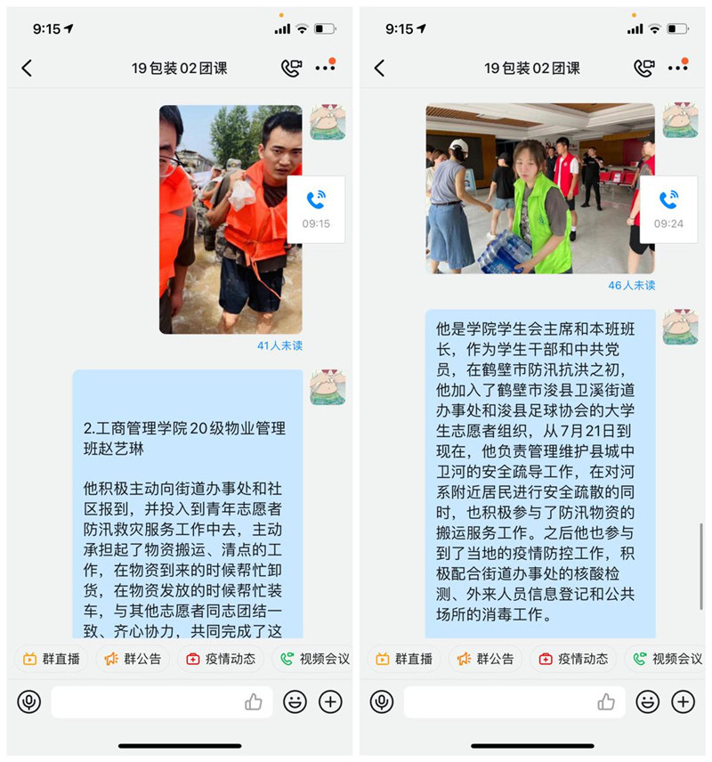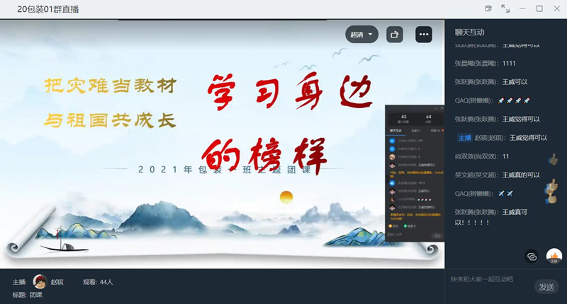 在此次团课活动中,各班主讲人通过钉钉直播、图文分享、播放视频等多种形式讲述了在我省防汛救灾和疫情防控工作中,我校广大师生众志成城、共克时艰的感人故事,尤其是身边优秀的青年学生榜样,无论是动物医院学院20级动医2班孙逸冰同学还是经济与贸易学院20级农业经济管理1班孙永康同学以及我院许多优秀学子,他们都投身到防汛救灾志愿服务中去,踊跃参与、冲锋在前、勇担重任,用实际行动展现了当代青年深厚的家国情怀和新时代青年的责任担当。最后,各班主讲人号召班内同学要向身边的优秀榜样学习,把困难当磨砺,在具体实践中涵养厚植爱国主义情怀。