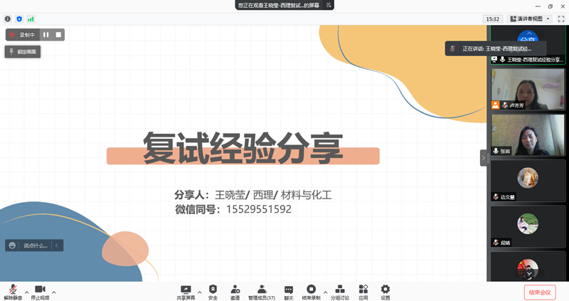 此次活动,来自河南大学、广西大学、西安理工大学及天津科技大学的五位优秀校友,依次向考生介绍复试流程、阐述复试经验、讲解注意事项、分析往年案例;几位校友均强调要规划学习时间,树立备考信心,踏实全面准备,正确面对调剂。互动答疑环节,同学们积极提问发言,几位校友逐一耐心回复。