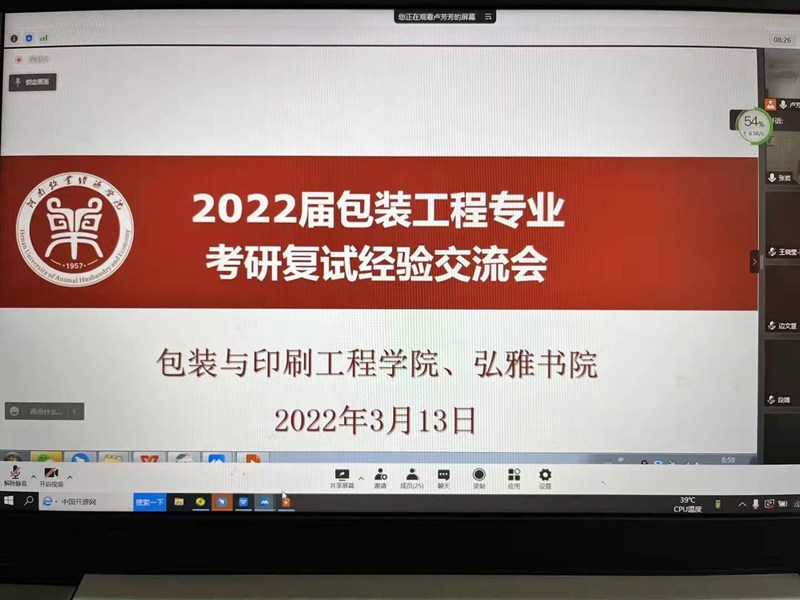 近日,全国研究生入学考试成绩陆续公布,为帮助考研毕业生更好地准备复试,提高考研复试成功率,从而获得更广阔的发展空间,我院联合弘雅书院于3月13日在腾讯会议开展2022年包装工程专业复试交流会。会议邀请上届成功上岸的五位优秀校友分享复试经验。WilliamHILL中国院长张岩、教科研主任苗红涛、弘雅书院团委副书记段婧出席,2022届考研毕业生参加。交流会由包装工程教研室主任卢芳芳主持。