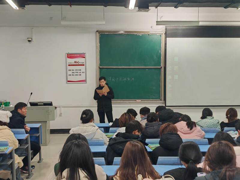 大学生活多姿多彩,大学生就像八九点钟的太阳,青春四溢,每一位同学都应该大胆站在大众面前展示自己的风采。活动过程中,2023级各班同学全员参与,以小组为单位,围绕“红色故事”、“青春梦想”、“经典诵读”、“文化自信”、“时代楷模”等主题提前搜集、研究、整理相关资料,在课前十分钟派代表结合自身经历进行演讲,带领班级同学学习英雄故事,领悟革命精神,分享青春梦想,传递积极向上的正能量,让听者有所感悟、有所提升。