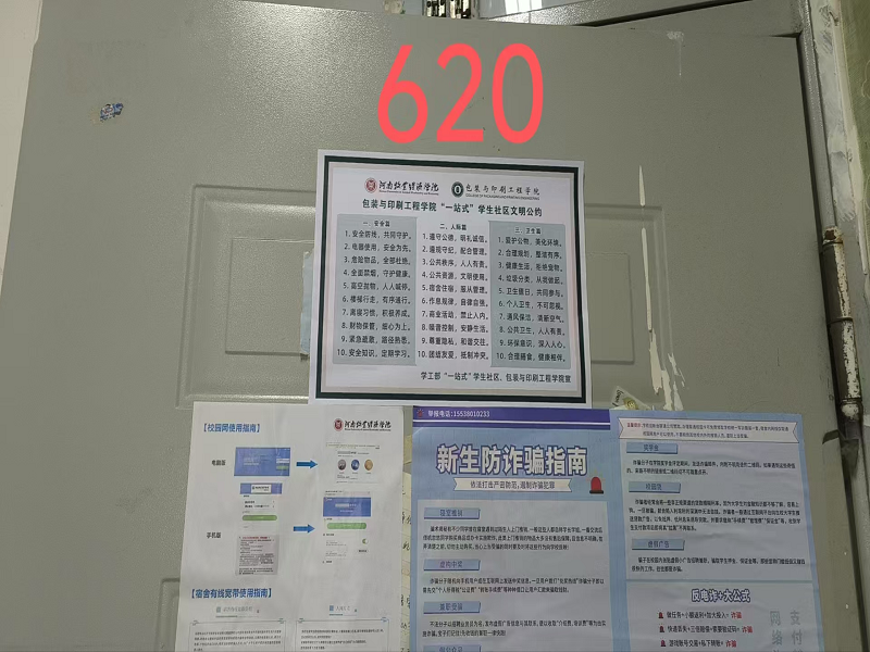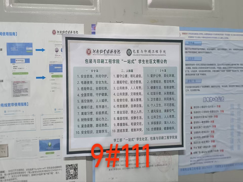 活动伊始,学院为每间宿舍发放了《“一站式”学生社区学生文明公约》,文明公约内容涵盖了宿舍日常管理、公共区域维护、作息时间协调、物品摆放规范等多个方面,倡导爱护公共设施、树立舍友间友好沟通的理念,条款简明而富有指导性,旨在帮助同学们明确行为规范、提升情感交流、营造整洁有序的居住环境。为加强日常践行,各宿舍将文明公约张贴在显眼位置,时刻提醒宿舍成员履行公约,争创五星宿舍,以此推动形成全体学生共同参与、互帮互助的积极氛围。