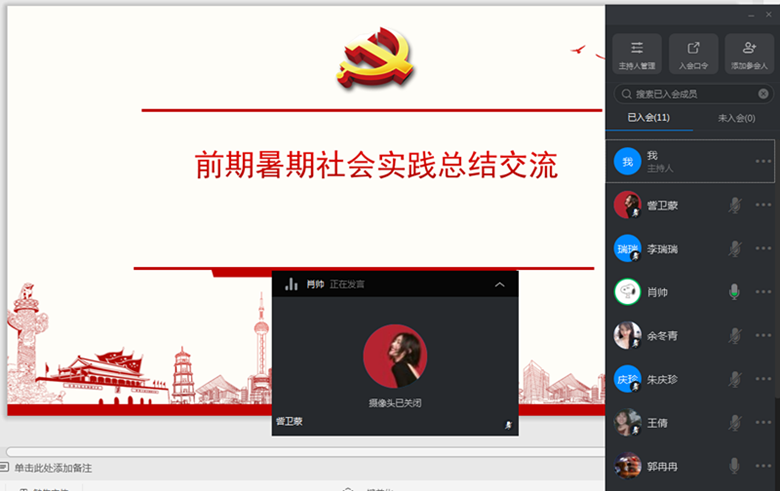 接下来,在暑假社会实践分享环节,学生党员们围绕“乡村振兴战略实施”和城市、“助力疫情防控和复工复产”的主题,结合自身调研实际,积极踊跃发言。在实践过程中,余冬青、訾卫蒙、李瑞瑞等学生党员走进乡村,扎根实情,关注农村留守儿童问题,为农村教育贡献自己的绵薄之力;肖帅、袁天鑫、郭冉冉等学生党员深入社区、商店、企业,深入走访调研,了解疫情带来的影响,并结合调研情况形成详细的调研报告。