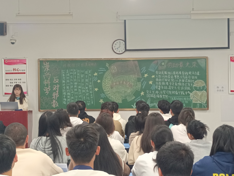 团课伊始,各班主持人以视频和PPT展示相结合的方式,通过生动的案例向同学们揭示了邪教的真实面貌,呼吁大家要崇尚科学,树立科学的世界观、人生观和价值观,掌握科学的思想方法,自觉抵御邪教的入侵。接着,主讲人以“劳动创造幸福,实干成就伟业”为主题,带领同学们学习人民日报近日发布的文章《总书记这样礼赞劳动创造》,号召同学们要大力弘扬劳模精神、劳动精神、工匠精神,争做新时代的奋斗者。