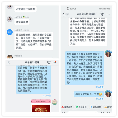 在此次团课上,各班主讲人带领大家学习心理健康知识和防疫知识,让大家认识到保持身心健康的重要性。其中,19包装一班主持人何怡同学谈到 “心情的愉悦是任何药物都无法代替的”,并通过自身实例,让同学们正确面对负面情绪,通过调适保持身心健康。19包装二班樊夏宁同学则以生命教育为题,探讨生命的意义,告诫同学们要珍爱生命,承担起生命的责任。正如《钢铁是怎样炼成的》中所所的“人最宝贵的是生命,生命只有一次”,有了责任和担当,我们才能有动力去奋斗。19印刷班张雅如同学则让大家积极分享保持身心健康的方法,号召大家日常生活中正确地认识自己,养成良好的生活习惯,以积极向上的心态面对生活和学习。