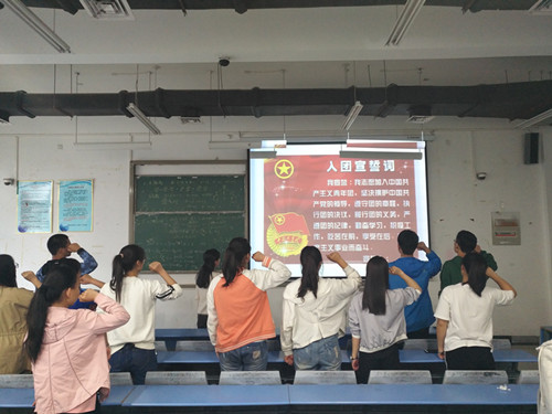 团课上,段老师结合共青团的历史,明确了新时代历史条件下作为一名共青团员的责任和义务。同时,段老师还回忆起了自己入团时的情景,时隔数十年,仍旧历历在目。接下来,段老师组织大家观看了共青团中央的《入团第一课》,让在座的团学干部对共青团的历史、章程和工作内容有了更为深刻的认识。段老师还结合当前大学生的思想状况,强调了开展“一学一做”教育实践活动的意义,说出了一个青年团员青年学生应该有的青春状态,字字锥心,发自肺腑。最后,段老师带领大家进行宣誓,重温入团誓词,在铿锵有力的宣誓声中,团课活动结束。