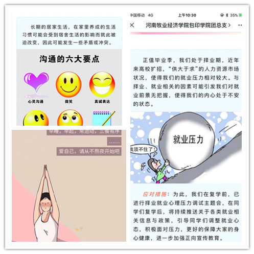 在学生居家学习阶段至复学归来,充分利用学校官网、微信公众号等新媒体平台,通过图文、视频、线上主题会等形式,围绕疫情居家心理调试、毕业季就业压力缓解、复学归来阶段的心理适应策略等帮助缓解学生的焦虑心理。