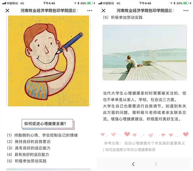 为进一步宣传大学生心理健康知识,提高同学们心理健康意识,增强大学生的自我心理调适能力,帮助大学生解决身心发展过程中的心理问题,提高大学生的心理健康水平和综合素质,促进大学生健康成长,全面发展。我院继开展心理健康知识竞赛后,通过展板、微信公众号进行心理健康知识宣传。