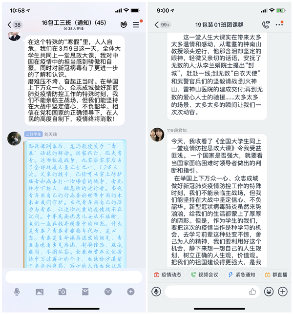 16级包装工程3班李艳说:“在这个特殊的“寒假”里,人人自危。我们在3月9日这一天,全国大学生共同上一堂思政大课,让我对中国在疫情中的担当感到骄傲和自豪,同时对新冠病毒有了更进一步的了解和认识。磨难压不垮、奋起正当时。在举国上下万众一心、众志成城做好新冠肺炎疫情防控工作的特殊时刻,我们不能亲临主战场,但我们能坚持在大战中坚定信心、不负韶华。相信在党和国家的正确领导下,疫情终将消散!”
