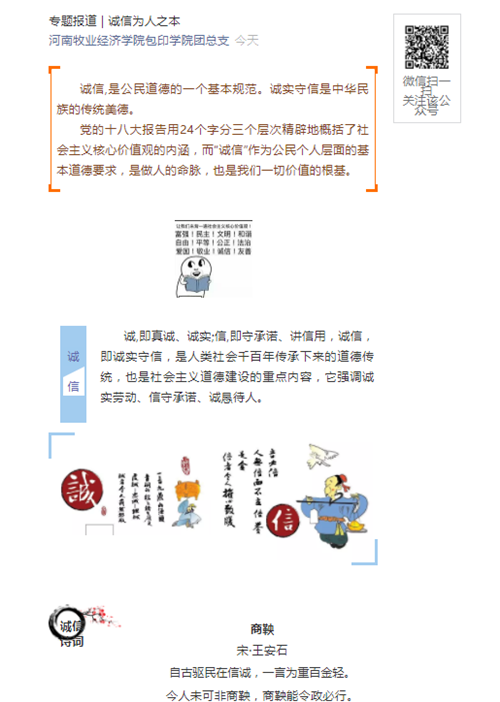 为了加强我院学生对诚信主题教育系列活动的知晓度和参与度,我院团总支第一时间利用微信公众平台发布了“诚信为人之本”的专题报道,通过各班积极学习和转发,帮助同学们树立诚信意识,带动我院学生积极参与到诚信主题教育活动中去。