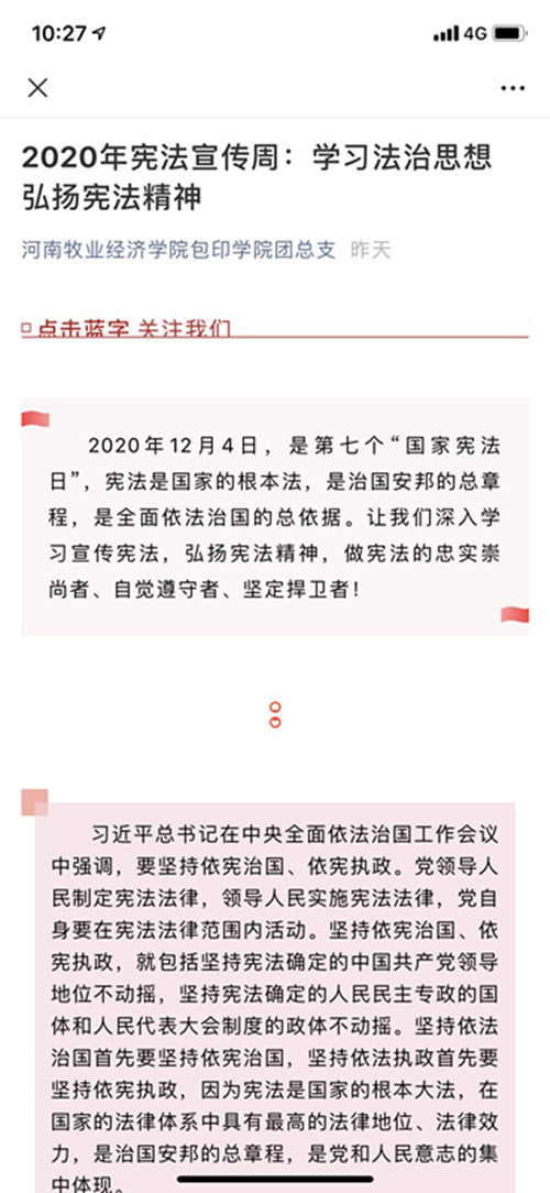 为增强学生的宪法意识,营造良好的宣传学习氛围,我院充分利用新媒体方式,通过宣传展板、团总支微信公众号、微博、QQ群等多种宣传手段,动员广大学生了解宪法日相关知识,引导大学生自觉成为宪法的忠实崇尚者、自觉遵守者、坚定捍卫者。
