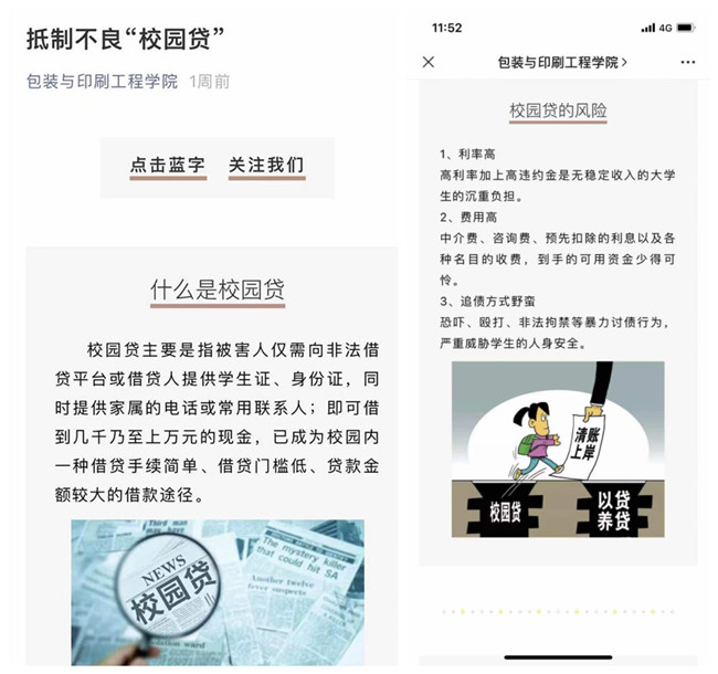 为进一步丰富防范不良校园贷的宣传形式,我院在学院微信公众号进行以“抵制不良校园贷,从我做起”为主题的推文宣传,详细讲解不良校园贷的现状及危害,并以案例的形式分析不良校园贷潜在的风险与危害。