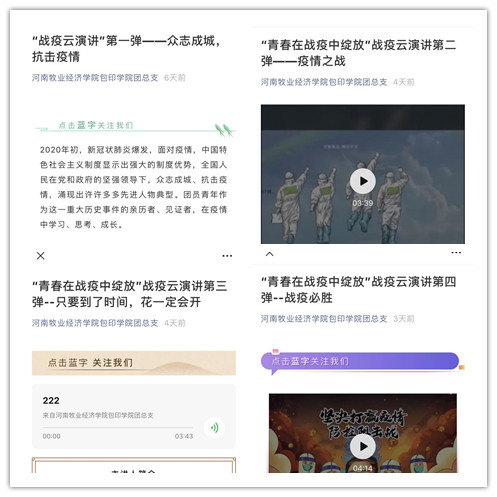 为贯彻党和国家中央关于疫情期间的重大决策部署,号召学院全体同学“同心抗疫”,弘扬新时代青年的正能量,我院近期利用微信公众号持续推出了“青春在战役中绽放”战疫云演讲系列活动。