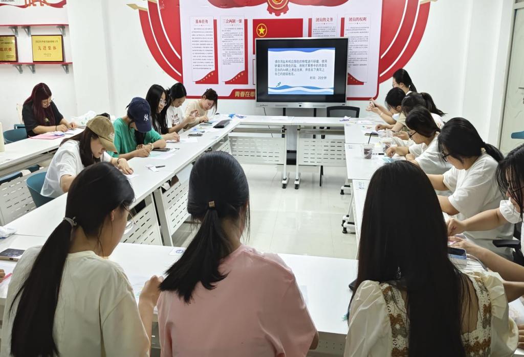 会议伊始,由主持人为参赛学生介绍活动内容、环节及举办的重要意义。本次活动共分三个环节,分别为“猜情绪”、“‘盐’磨情绪”和“再‘盐‘情绪”。活动期间,同学们以你画我听、绘画形式以及正念冥想等方式觉察情绪、表达情绪、释放情绪压力。其中“盐”磨情绪环节,参与者可通过研磨盐和彩色粉笔在纸上作画,将自己冥想时的情绪具象化,并向大家讲解自己作品的意义。新颖有趣的活动设计和丰富多彩的画作,让同学们获得精神上的释放与安定,引发积极反响。