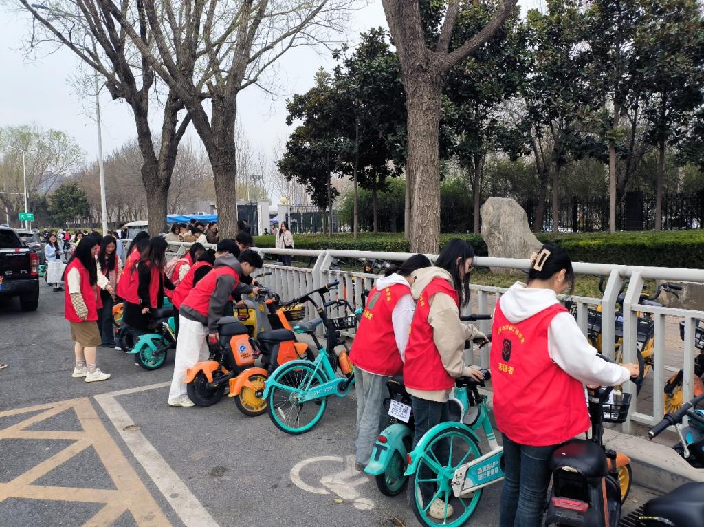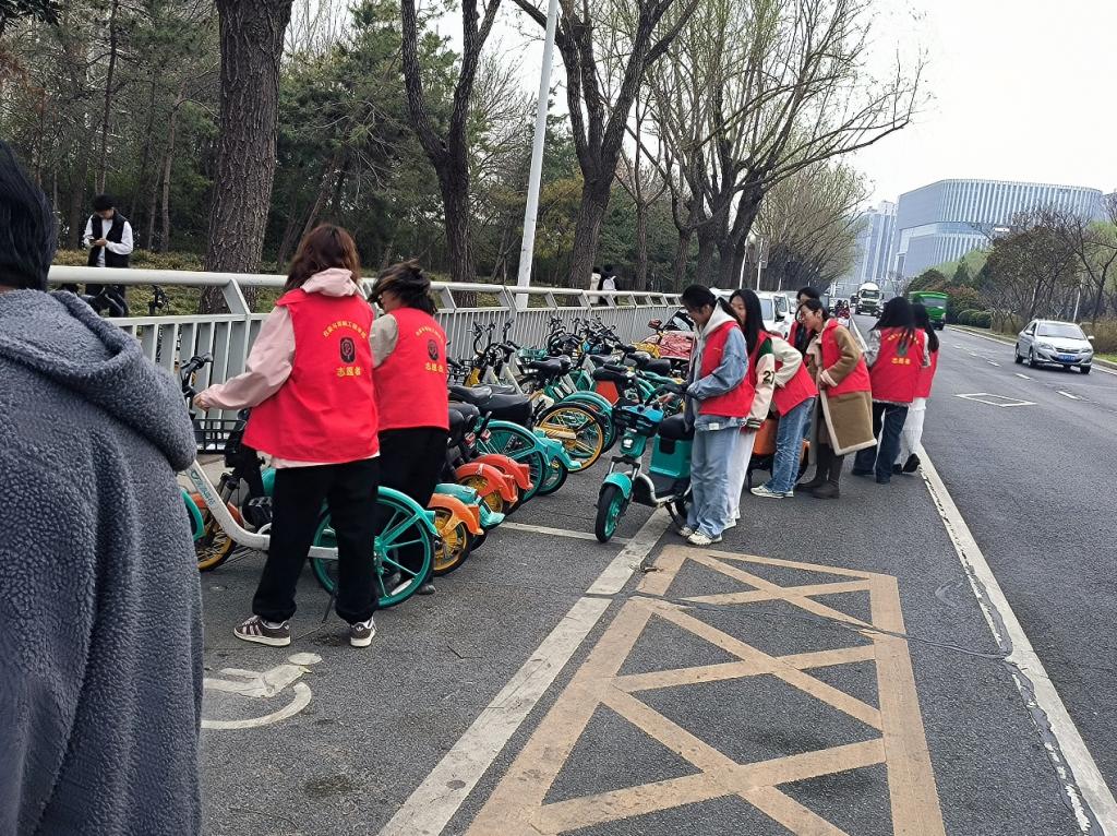 活动中,我院志愿者们分成几个小组,耐心地将龙子湖周边的电动车和随意摆放、倒放的单车进行了规范整理,按照规定方向和间隔摆放整齐,经过一下午的劳动,同学们将龙子湖周边的单车都规整了一遍。此外,志愿者们还向过往的市民宣传正确的自行车停放知识,鼓励大家养成良好的停车习惯,共同维护城市的整洁与美观,获得了过往市民的一致好评。