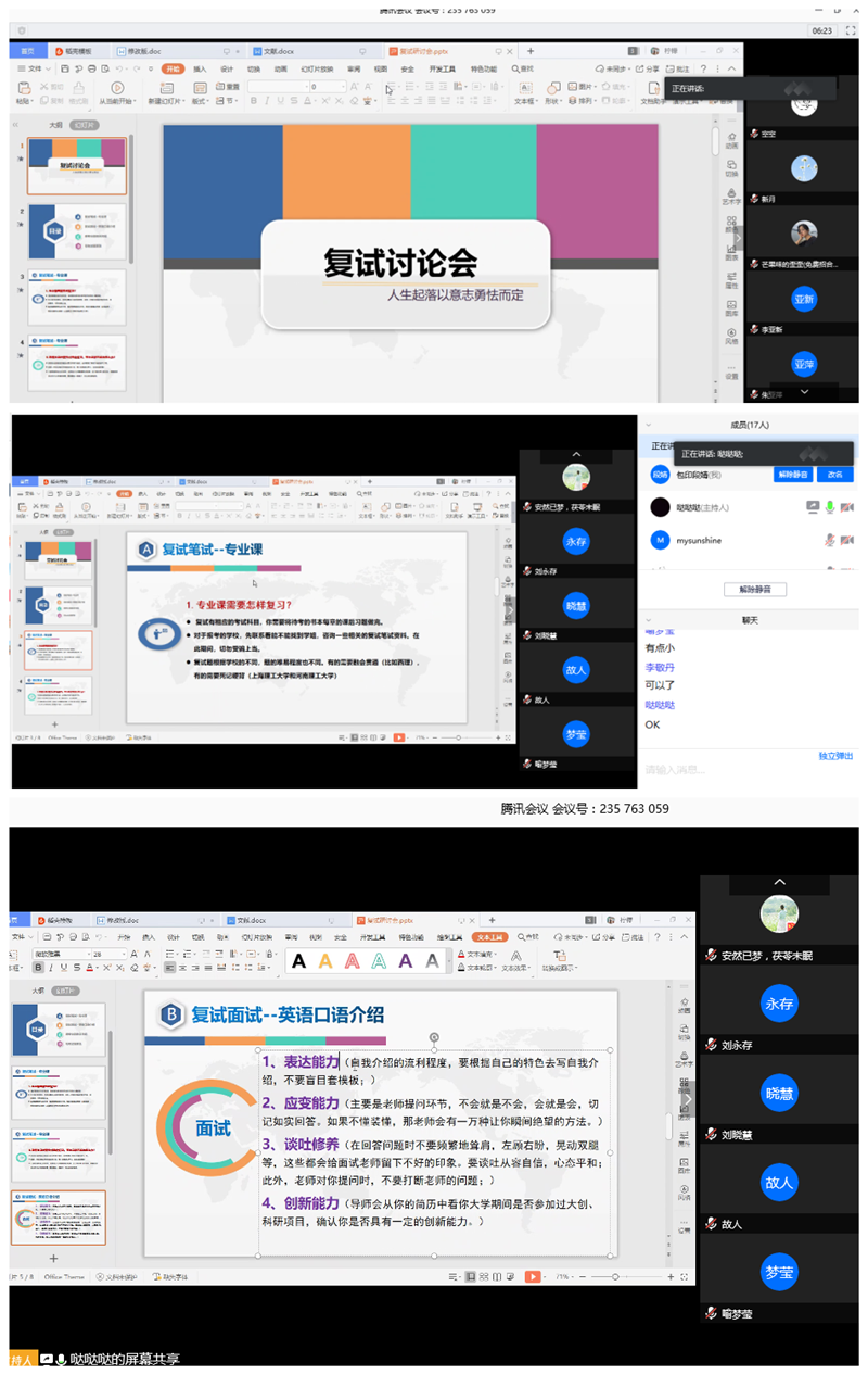 此次交流会以腾讯会议平台为依托,以PPT屏幕分享的形式开展。主讲人刘显萌结合自己考研复试的亲身经历,从如何联系导师、复试笔试、专业课面试、英语口语面试、面试所考察的能力几个方面进行了深入细致的讲解。在经验分享过程中,她鼓励学弟学妹们一定要调整好心态,不抛弃、不放弃任何机会和可能,尤其在当前疫情期间,面对复试形式和时间的不确定性,一定要制定好每天的学习计划,按照计划严格落实。之后,每一位同学都对自己关心的问题进行了提问,线上交流会气氛热烈,刘显萌同学与即将参加考研复试的学子积极互动,针对每一个问题都进行了认真解答。
