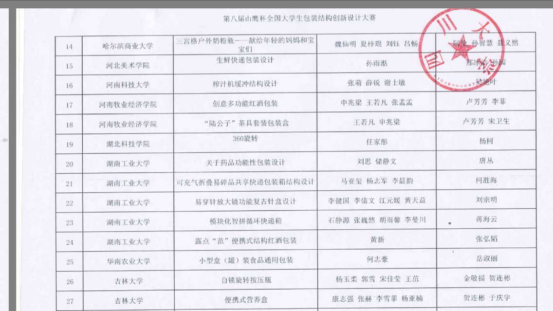 日前,2018年度中国包装创意设计大赛、第八届“山鹰杯”全国大学生包装结构创新设计大赛分别在江南大学、四川大学落下帷幕。经师生们的认真筹备、积极应赛,参赛作品荣获二等奖2项、三等奖4项、入围奖2项,成绩喜人。通过参加行业权威赛事,“以赛促教”、“以赛促创”的能力和水平得以提高,师生风采得以展示,行业社会影响力得以扩大。