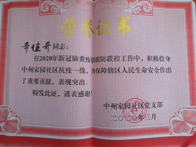 自疫情发生以来, 19级包装工程2班辛佳奇同学疫情期间每天在中州家园社区的卡口执勤、值班、检查进出人员通行证,参加了社区的一些抗疫活动。她积极响应党委政府号召,挺身而出、冲锋在前,为保障辖区人民生命安全作出了贡献。