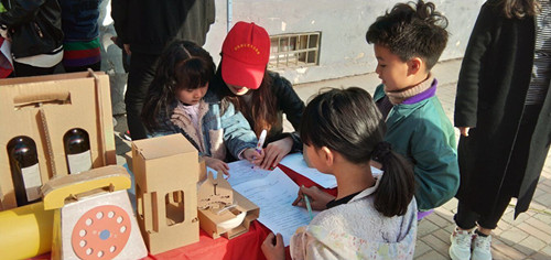 为了便于调研和环保知识的宣传,我院志愿者们专门提前准备了由废旧纸箱制成的小玩具以及由瓦楞纸动手制作成的兔子手机支架。志愿者们根据社区居民的实际情况,对不识字的老人和小朋友采取讲解、闲聊的方式,对年轻人则采取调查问卷的形式了解社区内大家对快递纸盒箱等的处理方式和对循环环保理念的认可度。
