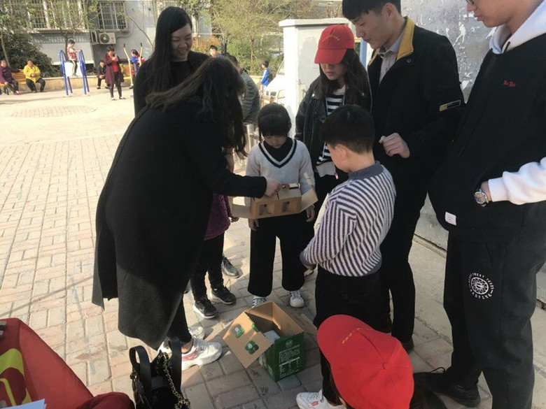 当天下午,由我院学生动手设计并由瓦楞纸板制作而成的置物架、红酒包装、茶具包装等优秀包装设计作品吸引了不少居民和小朋友前往驻足观看。志愿者们一面展示由废旧纸箱制成的小玩具成品,一面拿出准备好的纸箱材料,为小朋友们讲解示范如何利用废旧的纸盒和纸箱变废为宝,动手DIY变身精美的小玩具。