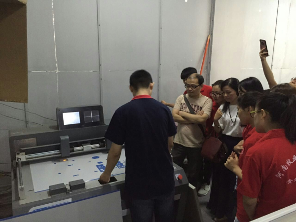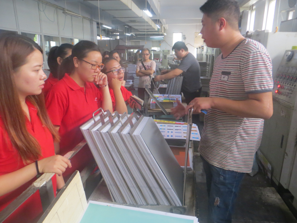 老师和同学们的到来受到了飞龙企业领导的热情接待。为了让队员们对企业的工作内容和环境有更全面的了解,在朱经理和就职于飞龙的我院优秀毕业生魏星的带领下,大家近距离参观了飞龙的各个车间。在参观过程中,企业负责人不仅对印刷环节的每一道工序都进行了认真讲解,而且还亲自上机操作演示,让大家对每一台机器的操作功能都有了全面的了解。在全程的观摩中,队员们都热情高涨,一边认真听讲解,一边做好笔记;面对讲解中负责人的提问则积极参与,现场气氛热烈。另外,企业还展示了为队员们所提供的崭新的电脑,企业良好的工作环境、热情周到的安排让同学们对接下来的培训和实践充满了期待。