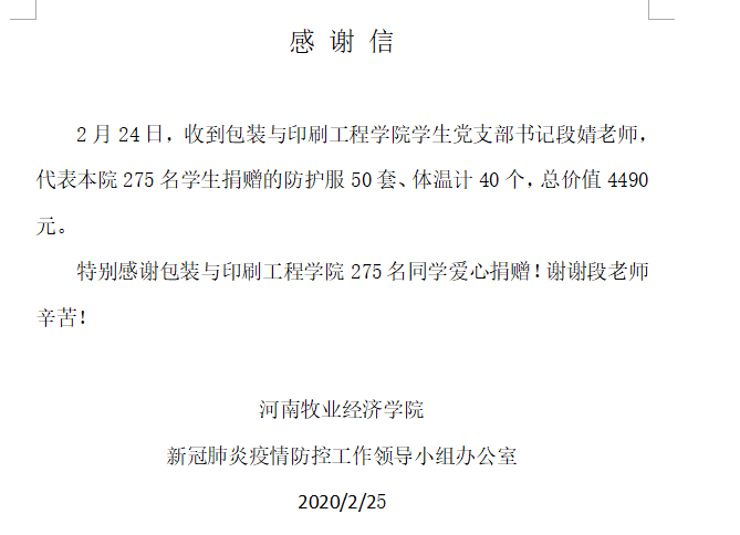 疫情牵动人心,决胜事在人为。2月24日下午,我院学生党支部书记段婧代表全院275名学子向校医院捐赠了50套医用防护服和40支体温计,总价值4490元。