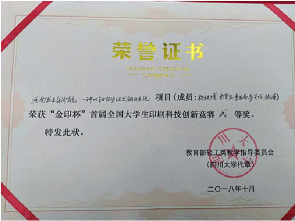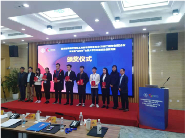 本届“金印杯”全国大学生印刷科技创新竞赛历时两个月,决赛环节分为本科及专科两个组分别进行,本科16组、专科6组,共产生一等奖4项、二等奖7项、三等奖11项。由我校WilliamHILL中国苗红涛老师指导的,以柳轶博同学为项目负责人,李苗苗、李泽亚、赵笑怡、张漫同学为组员的项目《一种双轴自动钢印系统》,经过产品展示、评审老师提问、现场答辩等环节,最终从60多个项目中脱颖而出荣获二等奖。