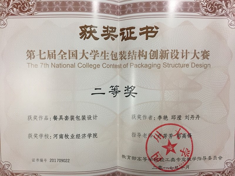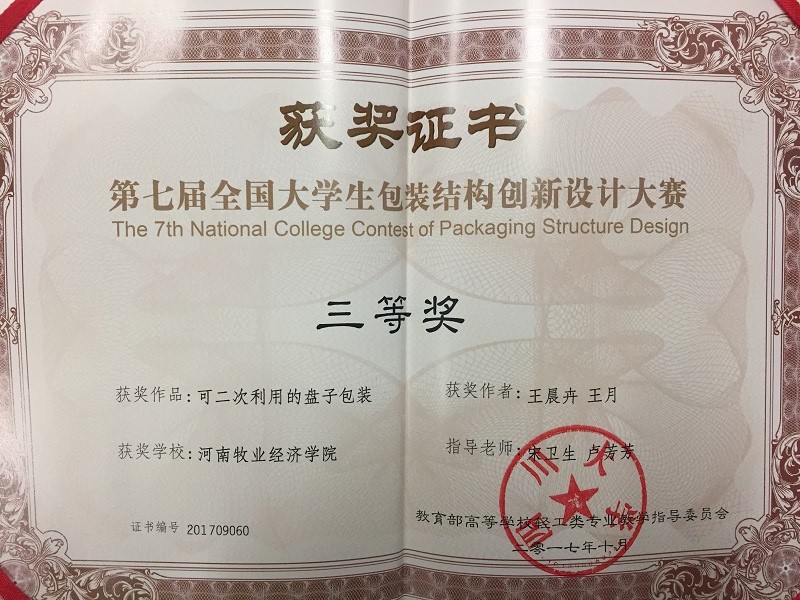 全国大学生包装结构创新设计大赛由教育部高等学校轻工类专业教学指导委员会主办。第七届赛事由教育部高等学校轻工类专业教学指导委员会包装工程专业指导组和天津商业大学共同承办,共收到来自全国包装类本科院校的708件作品,有112件作品获奖,作品获奖率为15.8%左右。我校共推荐了5件作品参加此次全国性比赛,作品获奖率为40%。
