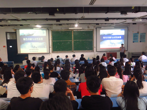 魏先福教授从印刷发展现状、绿色印刷水性油墨关键技术和研究成果几个方面进行阐述。首先,魏教授以“印刷可以做什么?”为题,引出印刷业发展的现状,以数据指出我国印刷业处于世界第二大国的状态,让同学们了解了行业发展的光明前景。然后,通过历史上发生的几次重大污染事件,结合国家相关政策,引出绿色印刷的必要性。随之提出水性油墨需要解决的难题:附着力差、难干燥、不易流平。通过自身多年的知识与经验,深刻剖析附着力机理、影响干燥和分散性的因素。之后,展示了其团队在UV喷墨油墨、无水UV胶印油墨、UV水性光油、荧光喷墨油墨等方面取得的丰硕成果。期间,我院师生、企业人士分别就考研及印刷方面的难题、生产实际困惑向专家请教,魏教授一一作答。