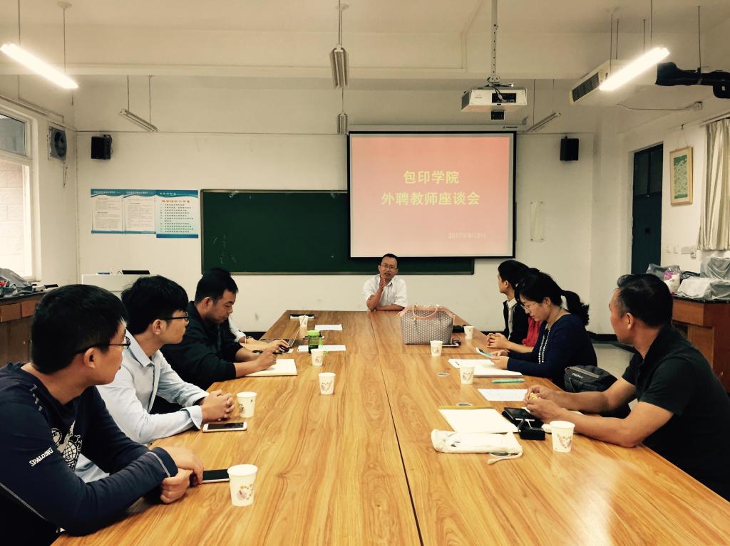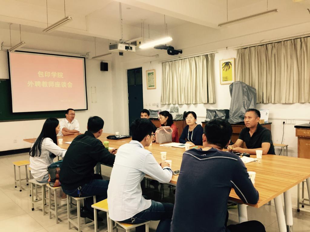 9月1日上午11:00,我院在学校龙子湖校区二号教学楼C225会议室召开了2017-2018学年第一学期外聘教师座谈会,学院副院长李自刚,学院科研秘书张岩、代教学秘书卢芳芳老师、包装教研室主任宋卫生、印刷教研室主任刘士伟以及4名外聘教师参加了座谈会。