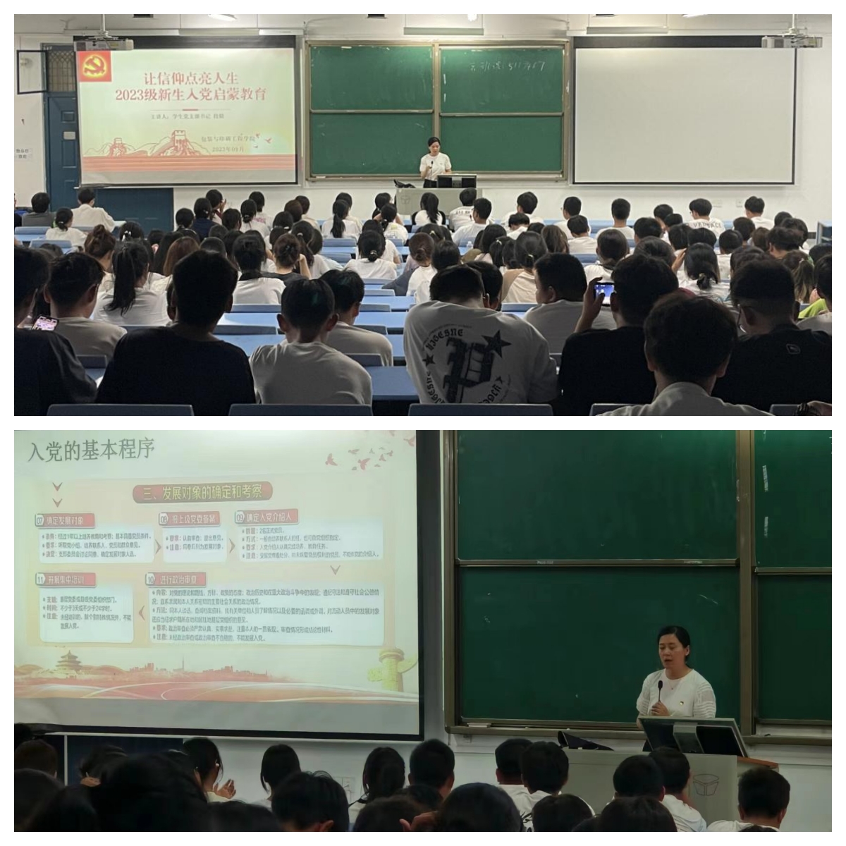 段老师以“让信仰点亮人生”为题,让新生们增强了对党的认识,激发了入党积极性。讲座上,她强调了大学生加入中国共产党的重要意义,希望大家端正入党动机、切实加强学习、积极发挥作用,自觉向党组织靠拢并接受培养、教育和考察,向身边的先进榜样学习,以实际行动早日加入党组织。最后,段老师向新生介绍了入党条件、党员发展流程和注意事项,并以优秀共产党人的感人事迹为切入点,和新生一起追忆峥嵘岁月,学习红色精神,感受先辈精神闪耀,传承革命精神。