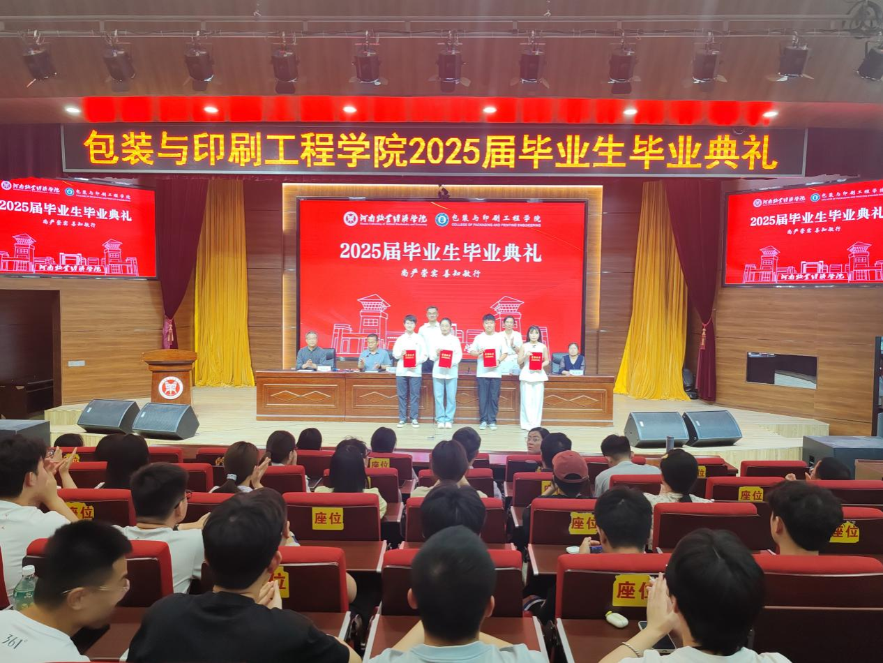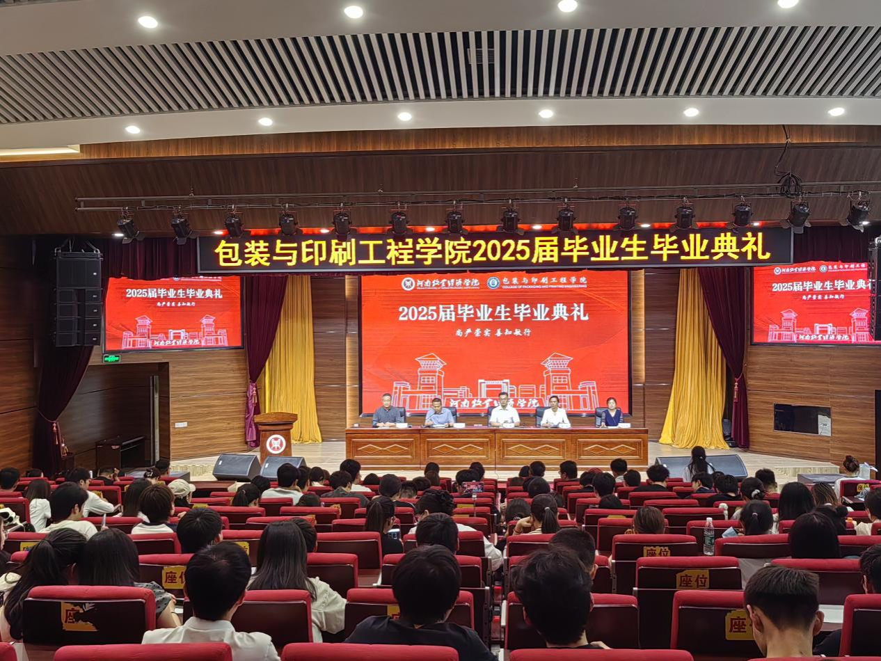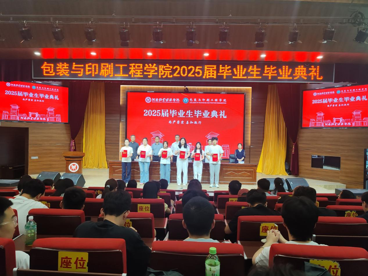 典礼在雄壮嘹亮的国歌声中拉开帷幕。院长张岩教授发表致辞。她深情回顾了与同学们携手共度的光阴岁月,代表学院向圆满完成学业的2025届毕业生致以热烈祝贺,并提出三点殷切期望:一是要坚定信念、志存高远,心系家国,做有理想、有担当的时代新人;二是要包容多元、敢于创新,秉持“包罗万象、装点未来”的专业精神,勇立潮头、服务社会;三是要心怀感恩、常念师恩,常回“家”看看,与母校同频共振、共谋发展。副院长刘士伟和苗红涛分别宣读了《关于表彰2025届省级优秀毕业生的决定》和《关于表彰2025届校级优秀毕业生的决定》。学院领导为获奖学生颁发荣誉证书,鼓励大家以荣誉为新起点,笃行致远,不负韶华。教师代表丁艳红博士饱含深情地寄语毕业生,希望大家坚守初心、勇担使命,以所学服务社会、以热爱点亮人生,始终不忘初心、赓续前行。21包装02班董雨欣、21包装01班付蓝莹、22包装02班李雯分别作为就业代表、升学代表和在校生代表发言。他们回顾了奋斗历程,畅谈青春理想,表达了对母校和师长的感恩之情,纷纷表示将以“尚严崇实,善知敏行”为精神指引,于新时代新征程上砥砺奋进、不负韶光。杰出校友、郑州拓彩纸制品有限公司总经理胡永辉先生应邀致辞。他结合自身成长经历,分享了对行业发展的见解与感悟,勉励学弟学妹厚植专业素养、提升综合能力,勇做时代的奋进者、开拓者、奉献者。