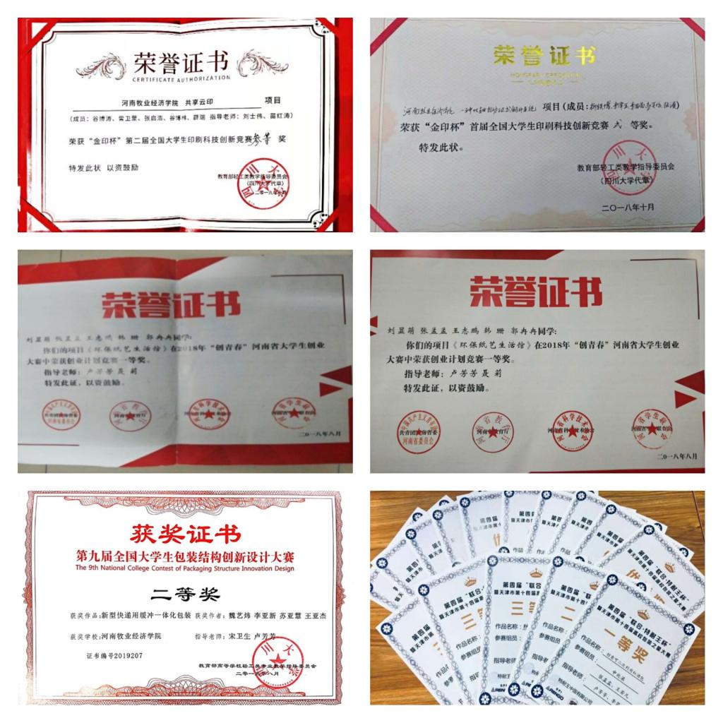 学院不断深化实践教学改革、促进应用型人才培养,立足专业特点,逐渐形成以组织学生参加各类大赛为背景的“以赛促教、以赛促学、学赛结合”的教学模式。学生参加全国大学生包装结构创新设计大赛、全国大学生印刷科技创新大赛、中国包装创意设计大赛、“挑战杯”“创青春”创新创业大赛等赛事,成绩突出,多次斩获一等奖。